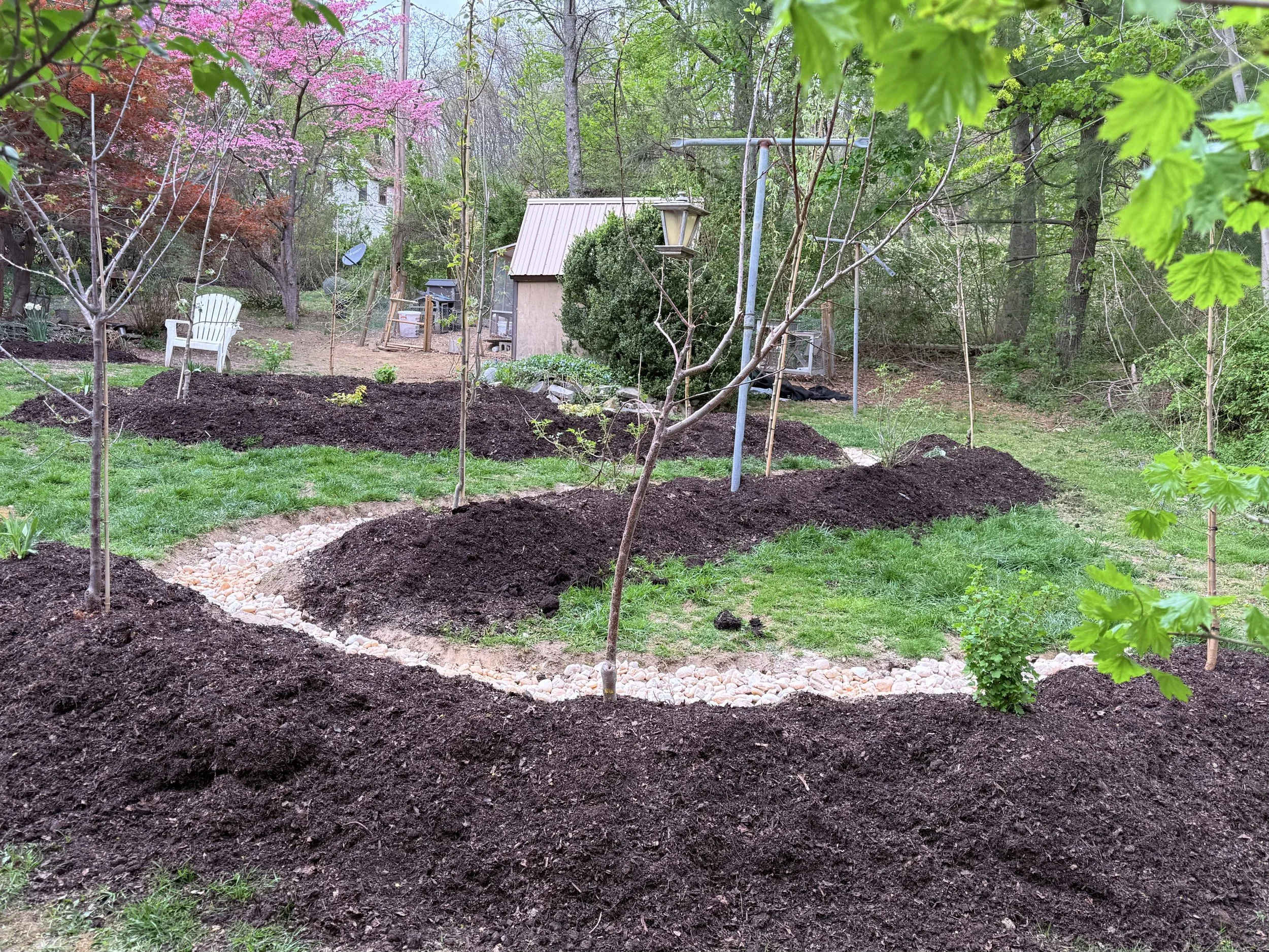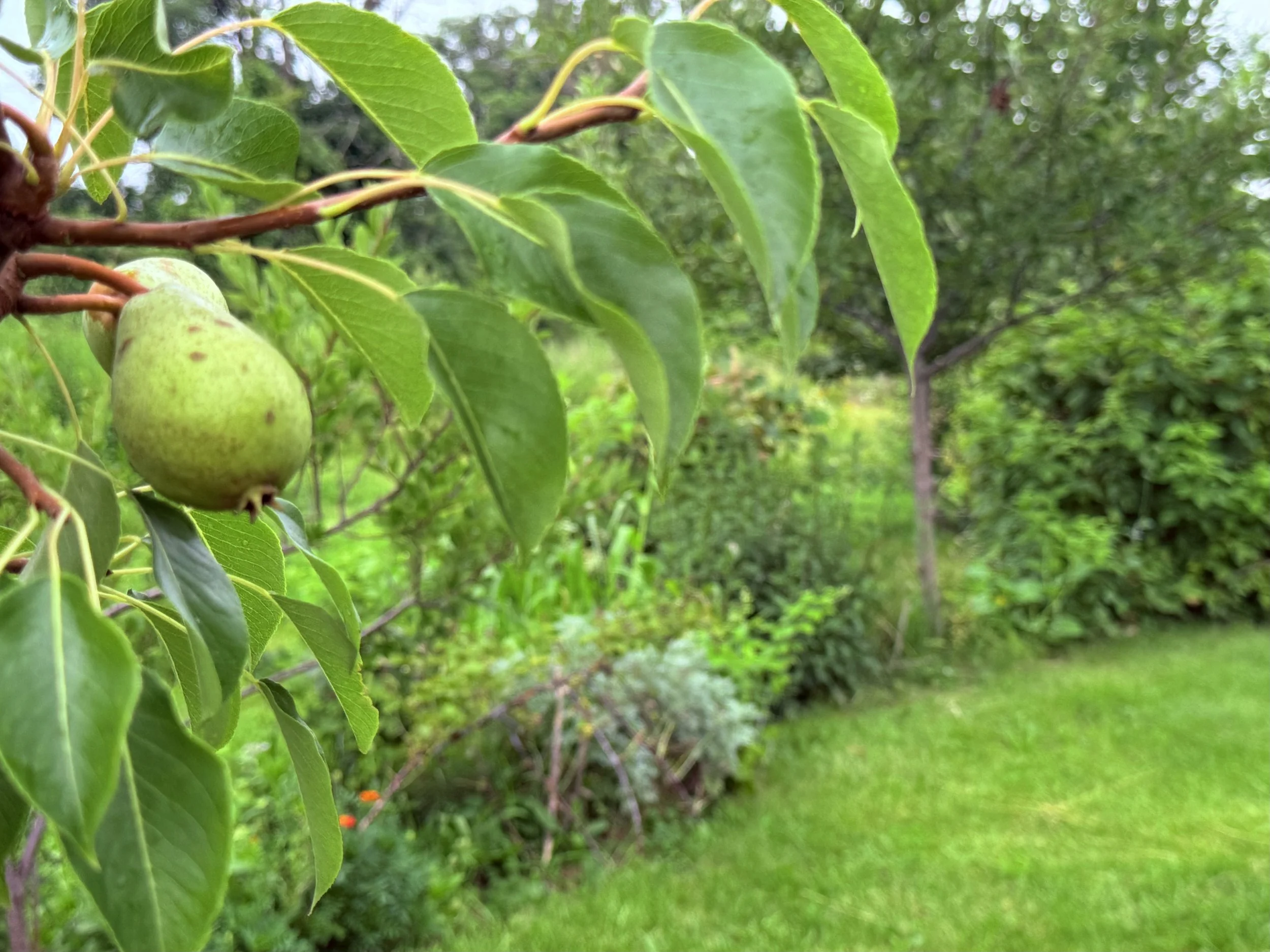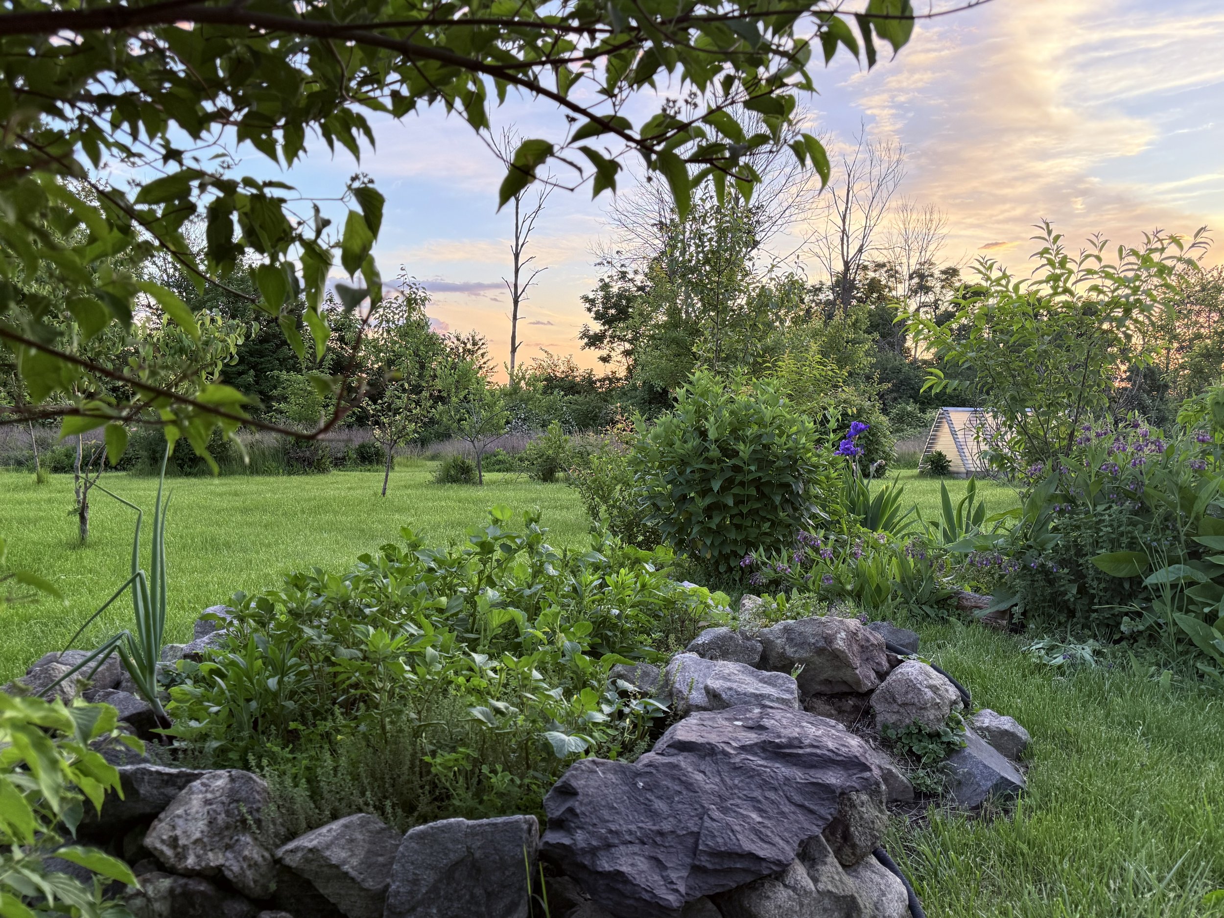 Often we avoid monoculture like the plague, we plant deciduous fruit trees together with nut trees, and evergreens and berry bushes. We interplant green manure trees. We plant nitrogen fixers like aronia, serviceberry, and elderberry. We ultilize members of the pea family, which produce nitrogenous fertilizer as well. We interplant some larger Keystone species trees. We plant shrubs, climbing fruit vines like grapes and hard kiwi. We involve native habitat and we really love to plant gooseberries.